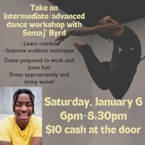 Come take an intermediate/advanced dance workshop with Semaj’ Byrd on Saturday, January 6 from 6pm-8:30pm. This is a unique opportunity for intermediate/advanced theatre dance students who want to learn combinations and audition techniques/strategies. He will cover a variety of styles and we will be dancing the entire class. Please eat before you come- you may bring water and a small snack (if needed). When you sign up, you are committing to attend (there is a class limit) and you will need to pay cash at the door before entering the class. You must stay the entire class- please wear proper clothing and shoes. Please be on time!